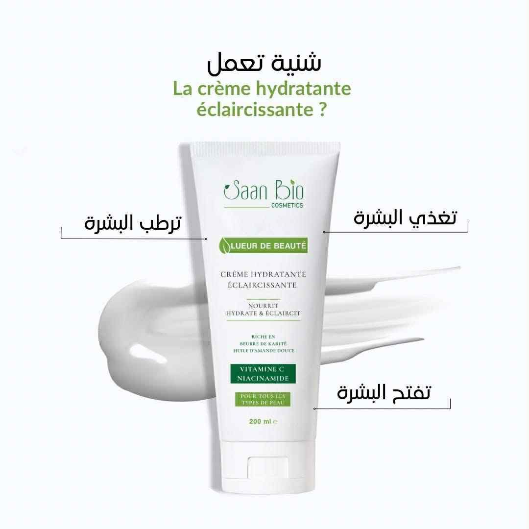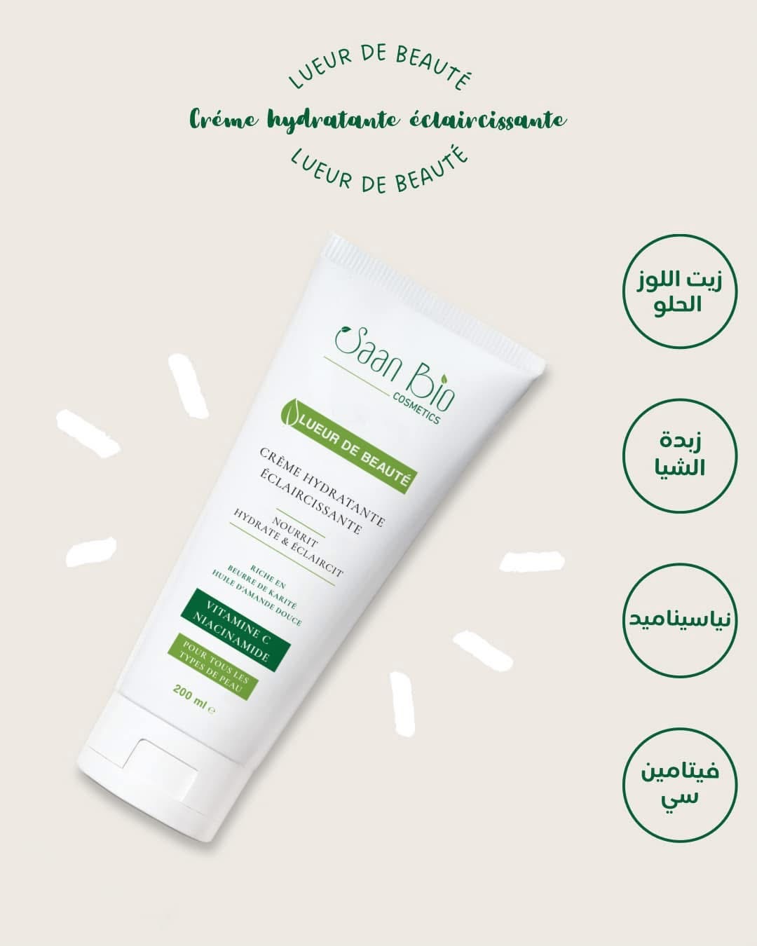 1. La Crème hydratante éclaircissante – LUEUR DE BEAUTÉ  🌸 تتكوّن من مكوّنات 100% طبيعية: 🌿 زبدة الشيا: ترطيب عميق وتنعيم للبشرة. 🌿 النياسيناميد: تفتيح البشرة ومقاومة التصبغات. 🌿 فيتامين C: يمنح إشراقة ولمعان طبيعي. 🌿 زيت اللوز الحلو: يوحد لون البشرة.