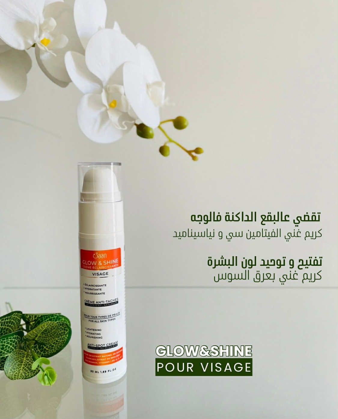 ✨ استمعي بإشراقة GLOW & SHINE! ✨ كريم تفتيح الوجه المضاد للبقع، مناسب لجميع أنواع البشرة 💖 غني بمكونات طبيعية مميزة مثل : مستخلص الزهور البيضاء 🌸 عرقسوس 🍃 نياسيناميد ☘️ الفيتامينات🌿 (C, E, B3, A) تضمن لك بشرة أكثر نضارة و توهجاً ✨ ||| نتائج مذهلة ||| تفتيح و توحيد لون البشرة ✨ ترطيب و حماية البشرة 💧 تقليل واضح لمظهر البقع الداكنة. 🌟 GLOW & SHINE هو السر وراء إشراقة بشرتك الطبيعية 💫